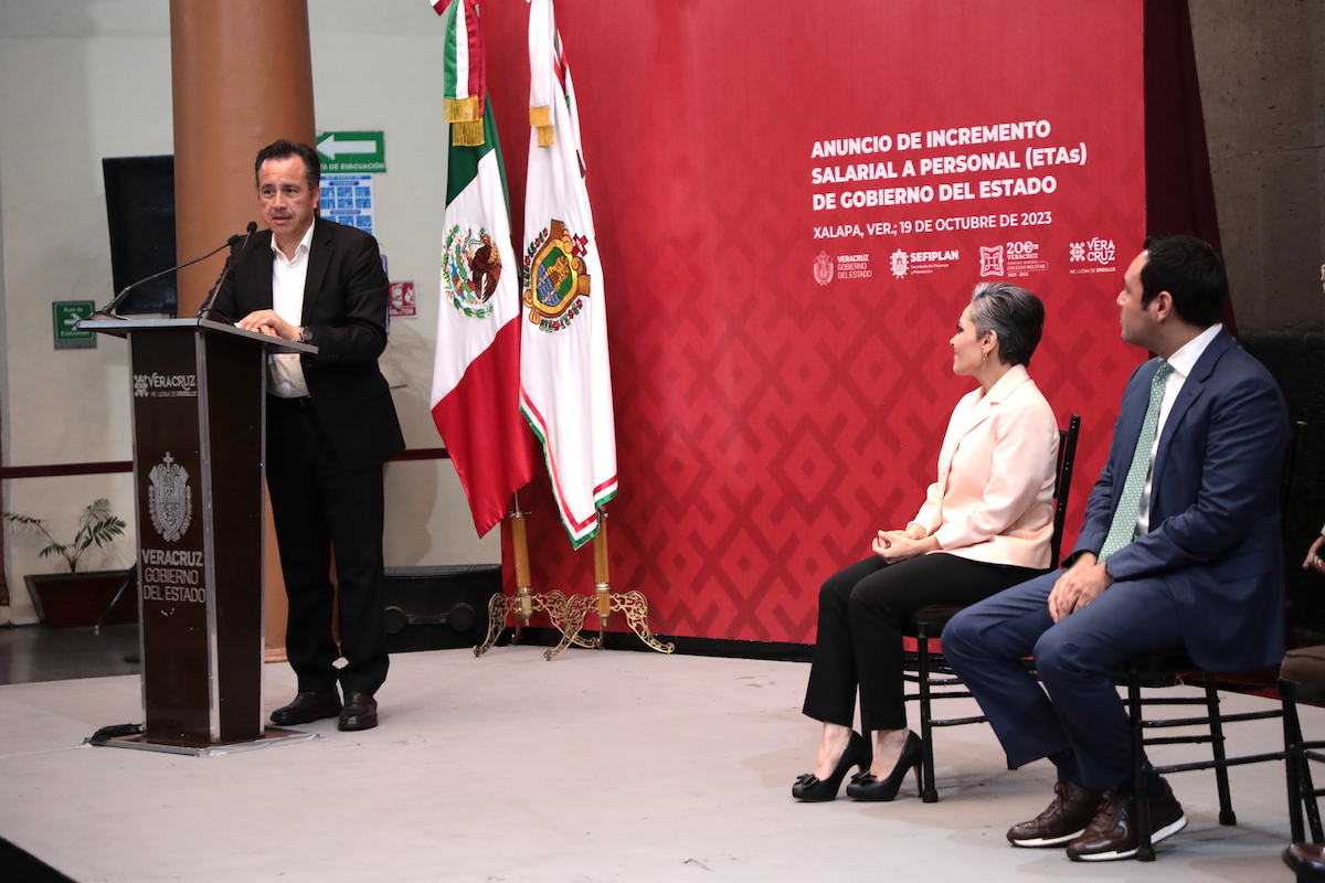 Xalapa, Ver., 19 de octubre de 2023.- En el marco del Día del Empleado Estatal, el gobernador Cuitláhuac García Jiménez dio a conocer el incremento salarial del 6 por ciento a partir de la segunda quincena de octubre, más un estímulo anual equivalente a 30 días de sueldo tabular para 5 mil 307 trabajadores sin base que, por años, han quedado rezagados en materia de retribuciones.