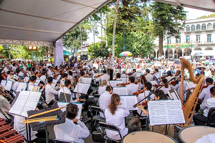 Xalapa, Ver., 21 de octubre de 2023.-Por medio de un concierto de la Orquesta Sinfónica de Xalapa (OSX), en el corazón político y cultural de la ciudad: el Parque “Benito Juárez”, la Universidad Veracruzana (UV) nuevamente alzó la voz en demanda del 4% del presupuesto general del estado, en apego a lo establecido en el Artículo 10 de la Constitución del Estado de Veracruz.