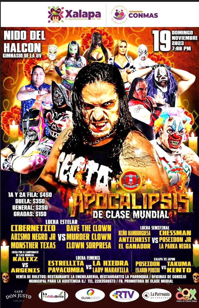Xalapa, Ver., 24 de octubre de 2023.- Con el fin de brindar asistencia alimentaria a población en situación de vulnerabilidad, continúa la venta de boletos para asistir al evento de Lucha Libre con Causa “Apocalipsis de Clase Mundial”, función programada para el 19 de noviembre a las 19:00 horas en El Nido del Halcón .