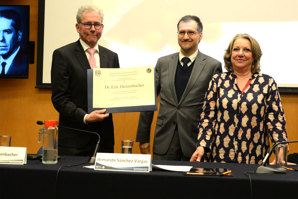 Erik Dietzenbacher, catedrático de la Universidad de Groeningen, prosiguió, tiene una obra que disipa una serie de cuestiones fundamentales del nuevo milenio. “Por ello, hoy la UNAM, a través del IIEc, rinde un merecido reconocimiento al otorgarle la Cátedra Ricardo Torres Gaitán a un intelectual que ha entregado cuerpo, mente y alma a la disciplina económica”, aseveró.