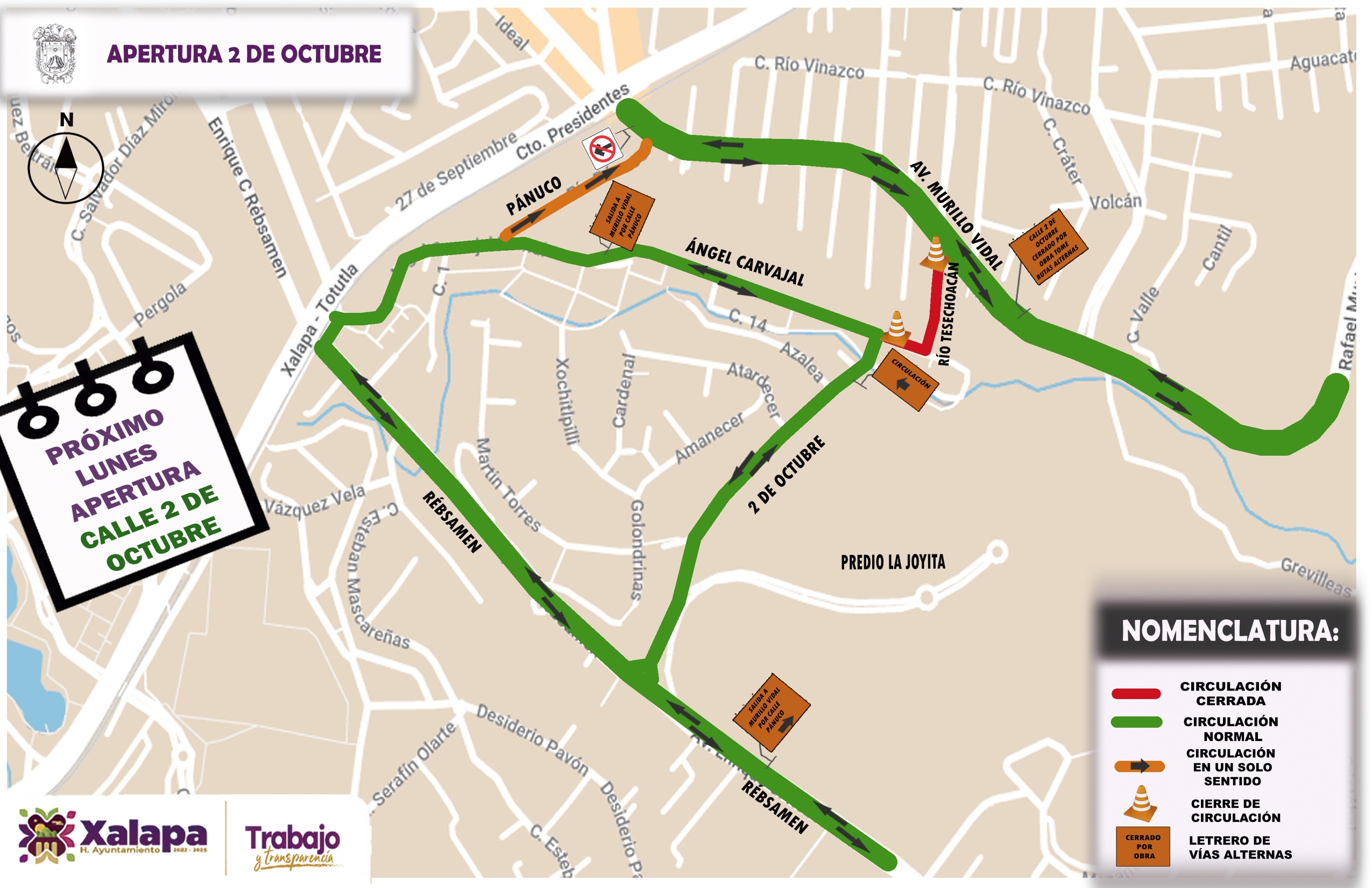 El jefe del Departamento de Movilidad Urbana, Alfonso López Pineda, expuso que esto ayudará a agilizar la vialidad en la avenida Rébsamen, pues con esta apertura los vehículos que normalmente circulan por Rébsamen podrán ocupar la calle 2 de Octubre para llegar a Ángel Carvajal, dar vuelta izquierda con dirección a Circuito Presidentes, tomar la calle Pánuco unos metros antes e incorporarse a la avenida Rafael Murillo Vidal.