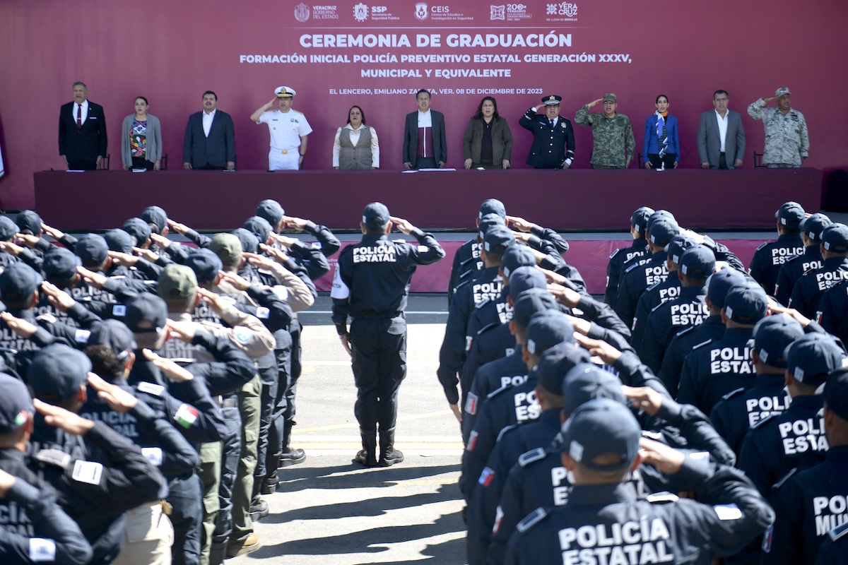 Xalapa, Ver., 08 de diciembre de 2023.- “Hemos hecho un gran esfuerzo por garantizar la seguridad y lo hemos logrado; hay mayor confianza en las corporaciones y somos la séptima entidad más segura del país, con una percepción que supera el 8 por ciento”, expresó el gobernador Cuitláhuac García Jiménez durante la graduación de cadetes del curso Policía Preventivo Estatal y Municipal.
