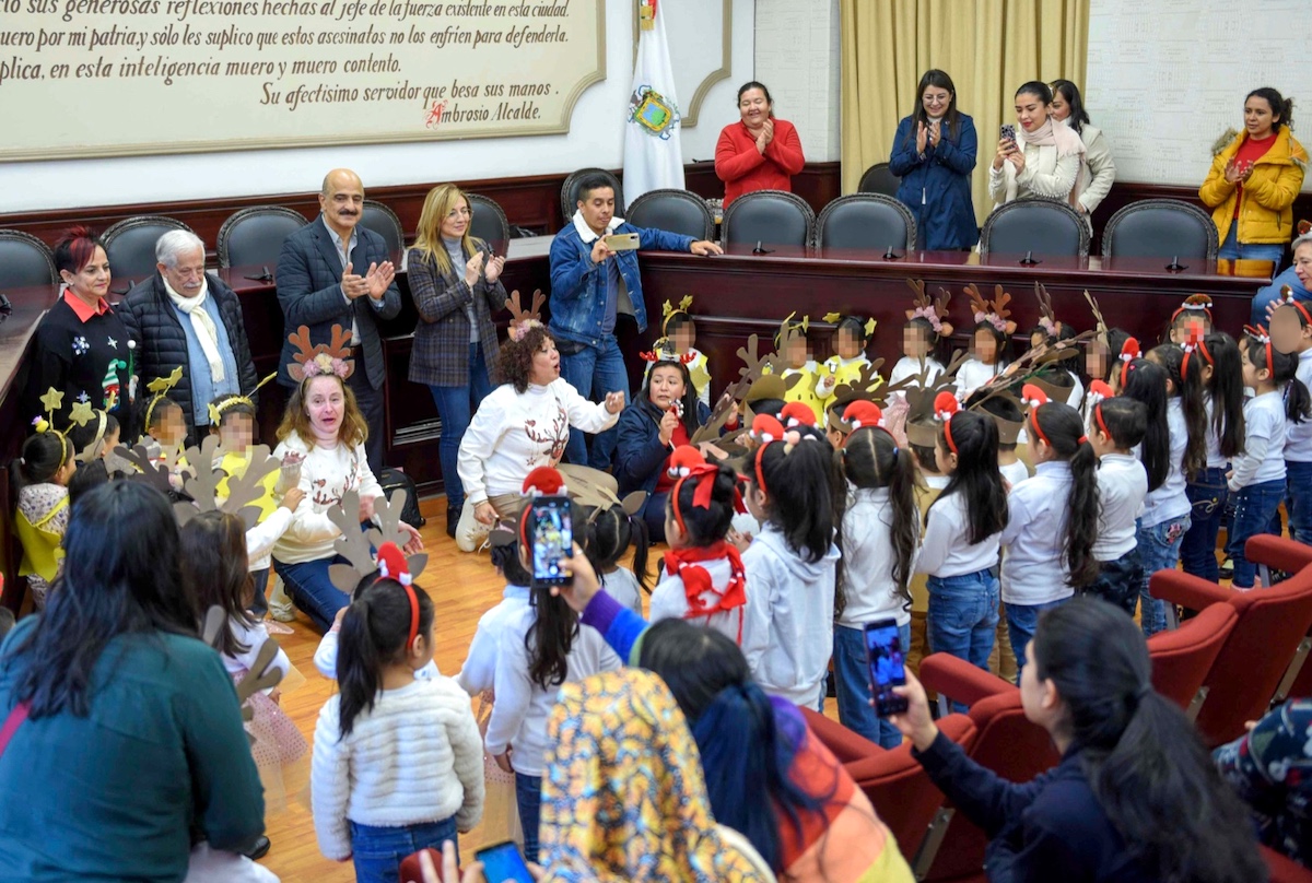 Acompañado por el maestro Alberto de la Rosa y la directora de Cultura, Karla Montano Rocher, el Edil agradeció esta visita y que las y los pequeños alegraran el Cabildo con canciones navideñas.