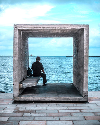 En ella, se ve a un hombre de espaldas sentado en uno de los cuadros de concreto de la Plaza del Migrante de la ciudad de Veracruz, quien dirige su mirada hacia los rompeolas que delimitan la entrada al puerto.