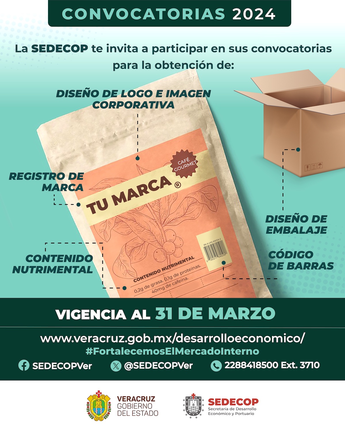 Xalapa, Ver., 30 de enero de 2024.- La Secretaría de Desarrollo Económico y Portuario (SEDECOP) invita a las micro, pequeñas y medianas empresas constituidas como persona física o moral, activas en territorio veracruzano y ante el Servicio de Administración Tributaria, a participar en las convocatorias Listos para Comercializar e Impulso Productivo 2024, vigentes hasta el 31 de marzo.