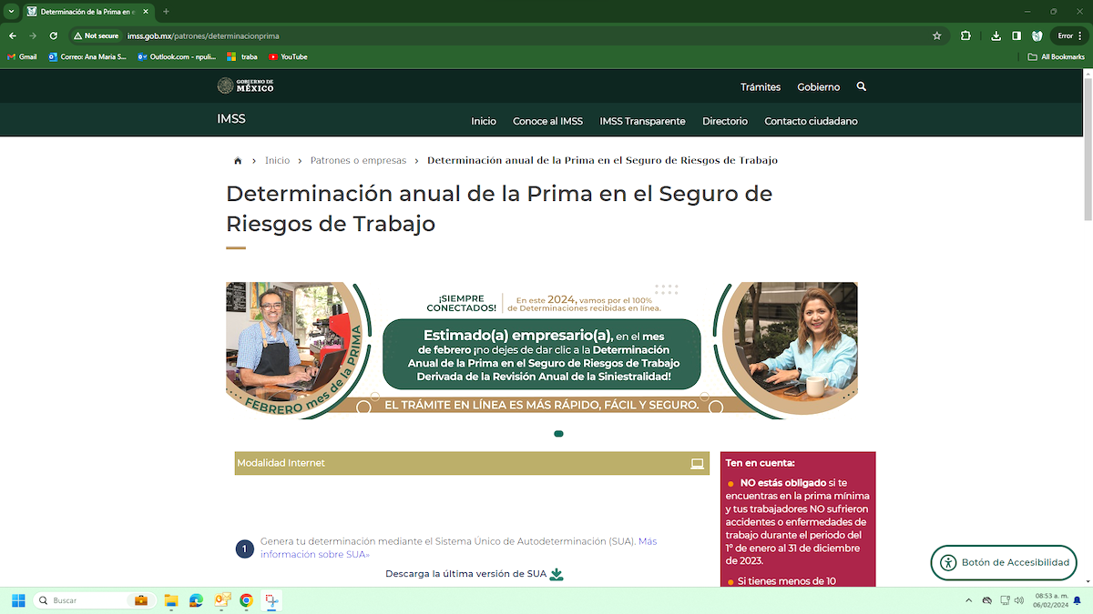 Xalapa, Ver., 08 de febrero de 2024.- El Instituto Mexicano del Seguro Social en Veracruz Norte hace un atento recordatorio a los patrones para presentar la Determinación de la Prima del Seguro de Riesgos de trabajo, para el ejercicio 2024, la cual puede realizarse únicamente durante el mes de febrero.