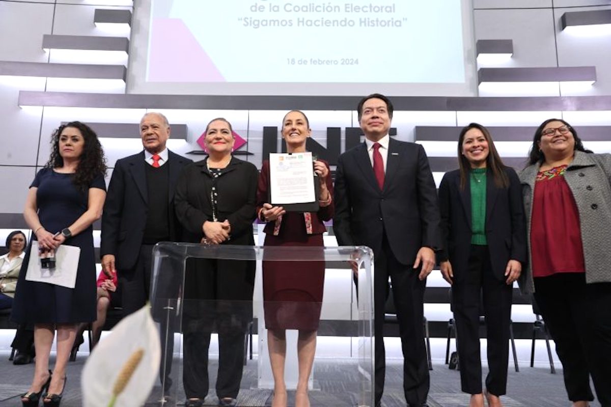 Ciudad de México, 18 de febrero de 2024.- En el marco del PEF, el Instituto Nacional Electoral recibió la solicitud de registro como candidata a la Presidencia de la República de la coalición “Sigamos Haciendo Historia”, integrada por Morena, el Partido Verde Ecologista de México y el Partido del Trabajo, de Claudia Sheinbaum Pardo.