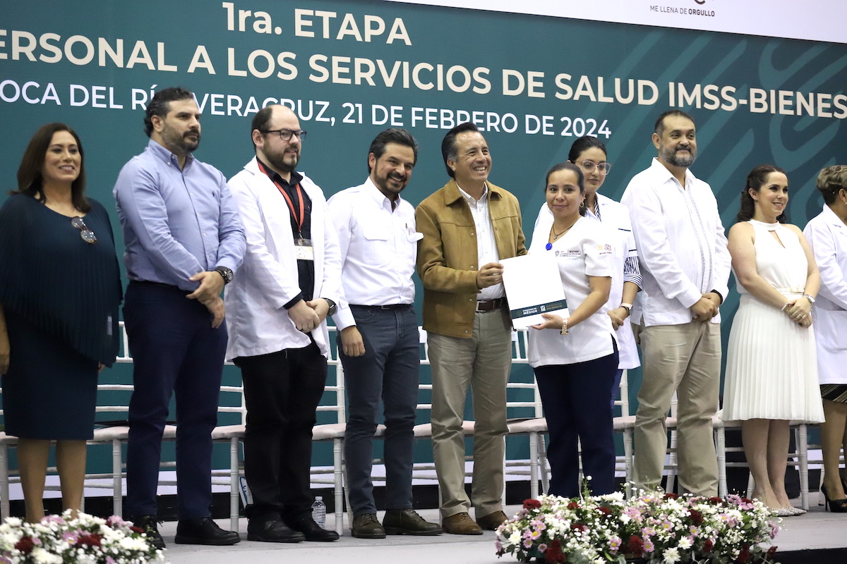 Veracruz, Ver., 21 de febrero de 2024.- El Instituto Mexicano del Seguro Social y el gobierno de Veracruz entregaron 3 mil 328 bases a trabajadores de la salud incorporados al Órgano Público Descentralizado IMSS-Bienestar en la entidad, durante la primera etapa para regularizar la situación laboral de personas que desempeñan disciplinas médicas, de enfermería y paramédicas, y que se encuentran contratadas bajo condiciones precarias o temporales.