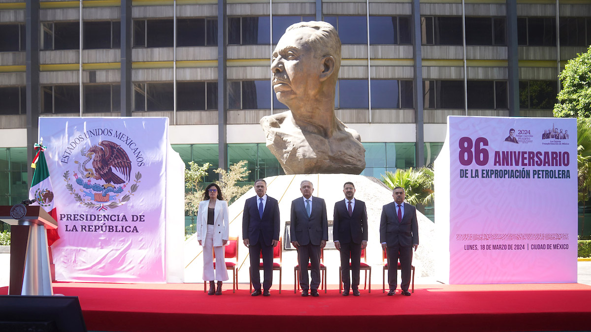 Ciudad de México, 18 de marzo de 2024.- En la conmemoración del 86 Aniversario de la Expropiación Petrolera, el presidente Andrés Manuel López Obrador afirmó que es fundamental continuar la ruta hacia la autosuficiencia en la producción de petróleo, gasolinas y combustibles en tanto se consolida la transición hacia energías limpias y renovables para cuidar el ambiente.