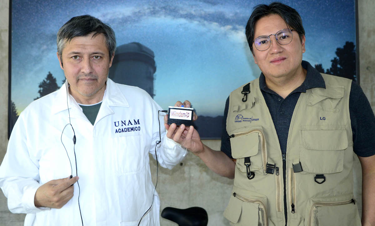 Ciudad Universitaria, 03 de abril de 2024.- A fin de que el mayor número de personas disfruten del eclipse solar del próximo 8 de abril, investigadores del Instituto de Astronomía (IA) de la UNAM desarrollaron Miimdam, nombre otorgado en honor al pueblo o’dam o tepehuanos, cuyo significado es luz. Es un instrumento que permite a quienes presentan debilidad visual escuchar al Sol y cómo se oculta durante el fenómeno natural.
