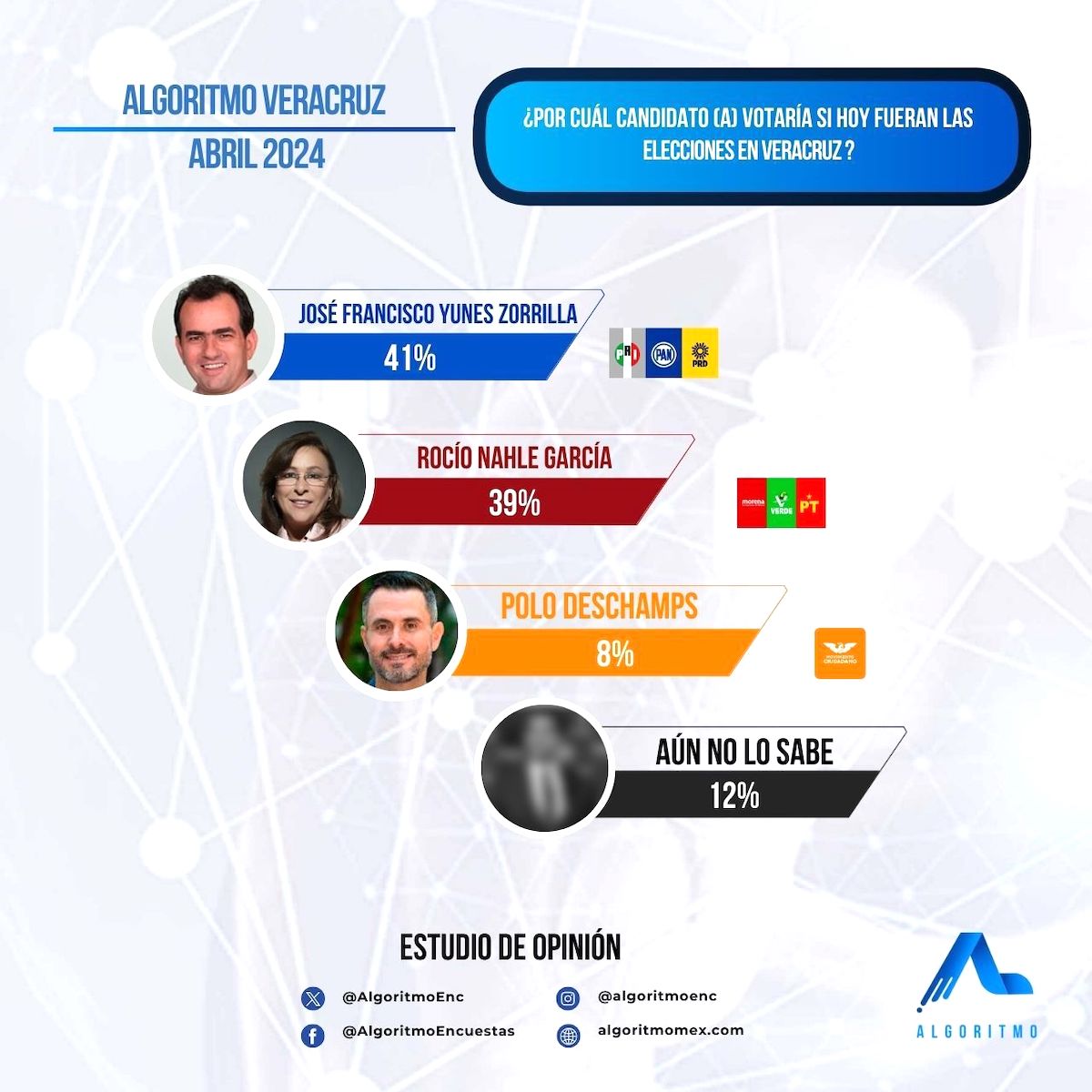 Un ejemplo es el estudio de opinión publicado por el grupo Algoritmo, correspondiente a la primera quincena de abril. A la pregunta “¿Por cuál candidato (a) votarías si hoy fueran las elecciones en Veracruz?” 41 por ciento de las personas encuestadas respondieron que lo haría por José Francisco Yunes Zorrilla, 39 por ciento dijeron que por Rocío Nahle García, 8 por ciento que Polo Deschamps y 12 por ciento que aún no saben.