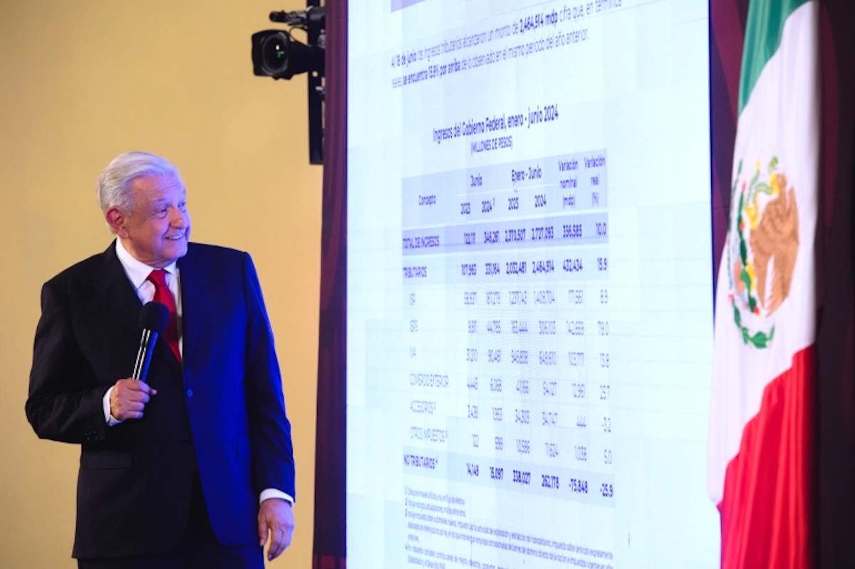 En el Salón de la Tesorería presentó los ingresos tributarios al 18 de junio; alcanzaron 2 billones 464 mil 914 millones de pesos. La cifra, en términos reales, se encuentra 15.9 por ciento por arriba de lo observado en el mismo periodo de 2023, es decir, representa 432 mil 434 millones de pesos más en lo que va de este año, de acuerdo con datos del Servicio de Administración Tributaria (SAT).