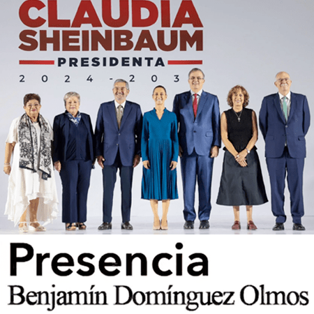 Presencia. Benjamín Domínguez Olmos Regularmente un político se balancea entre la oportunidad y el oportunismo… (Froylán Flores Cancela) La virtual presidenta electa, Claudia Sheinbaum, presentó este jueves a los primeros seis integrantes de su Gabinete presidencial. En el Museo Interactivo de Economía del Centro Histórico de la Ciudad de México, Presentó a tres hombres y tres mujeres, quienes serán parte de su Gabinete a partir … Continúa leyendo Claudia Sheinbaum presentó 6 integrantes de su gabinete