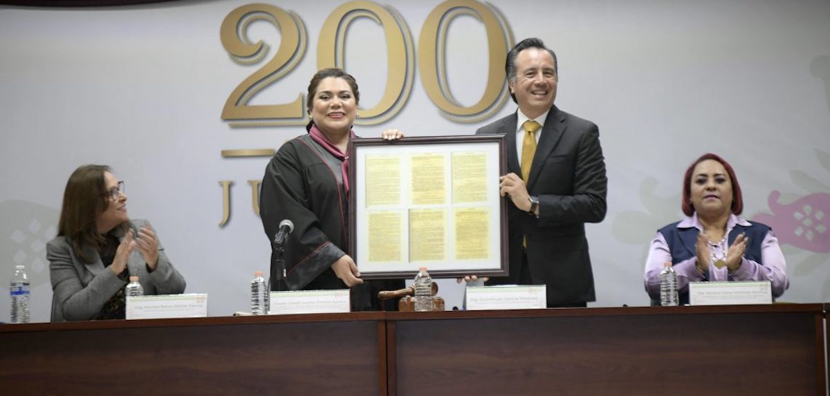Como muestra de su reconocimiento a la labor de impartir justicia, el mandatario cedió el documento que, además de considerarse un hito en la defensa de los derechos y dignidad de los veracruzanos, fincó los poderes Ejecutivo, Legislativo y Judicial de la entidad y la declaró un estado independiente, libre y soberano.