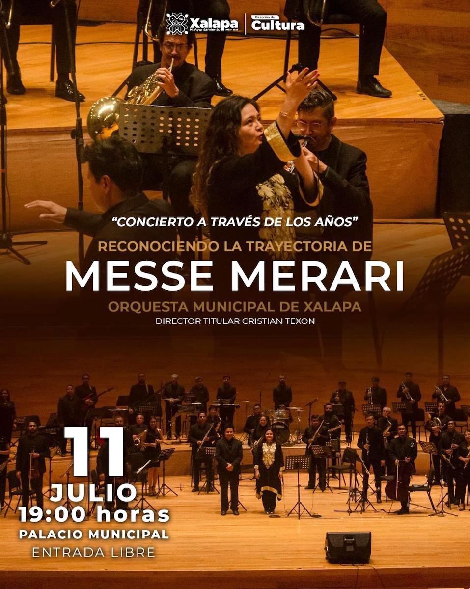 Xalapa, Ver.., 09 de julio de 2024.- El Ayuntamiento de Xalapa, a través de la Dirección de Cultura, reconocerá la trayectoria artística de Messe Merari con el concierto gratuito “A través de los años”, a cargo de la Orquesta Municipal de Xalapa (OMX). El evento se desarrollará este jueves 11 de julio, a las 19:00 horas, en el patio central de Palacio Municipal.