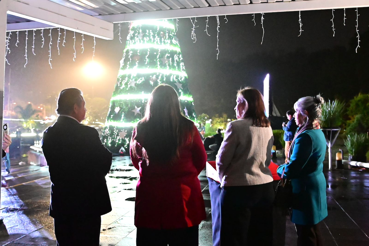 Junto a la directora del organismo, Clara Mora Juárez y sus colaboradores, congregados en la explanada, la Gobernadora hizo el conteo regresivo para apreciar la iluminación del pino y luces propias de las tradiciones.