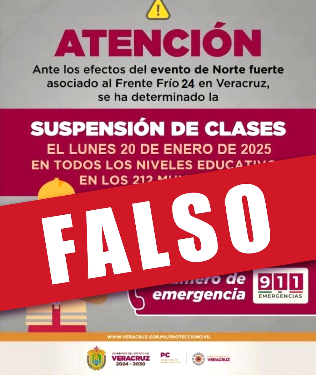 Xalapa, Ver., 19 de enero de 2025.-El Gobierno del Estado a través de las Secretarías de Educación y de Protección Civil de Veracruz desmienten que este lunes 20 de enero se vayan a suspender las clases en todos los niveles educativos debido a los efectos del Frente Frío no. 24.