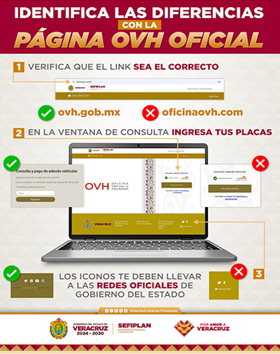 Por lo anterior, Sefiplan reitera que la única página oficial de la Oficina Virtual de Hacienda es https://www.ovh.gob.mx/. Además, recuerda que los descuentos autorizados para el pago de derechos vehiculares son del 15 por ciento durante enero y del 8 en febrero.