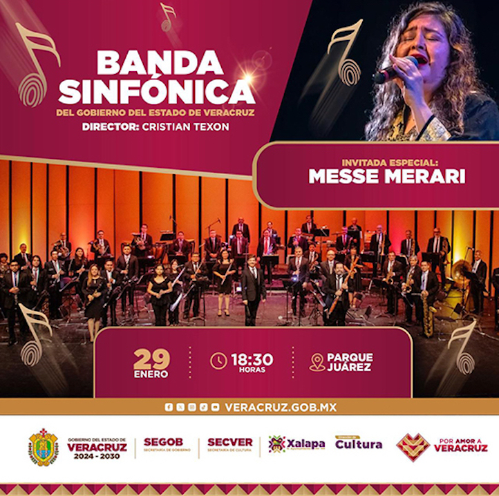Xalapa, Ver. 23 de enero de 2025.- En el marco de los 139 años de su fundación, la Banda Sinfónica del Gobierno del Estado de Veracruz, bajo la dirección de Cristian Texon, ofrecerá un concierto gratuito en el parque Benito Juárez el próximo 29 de enero a las 18:30 horas.