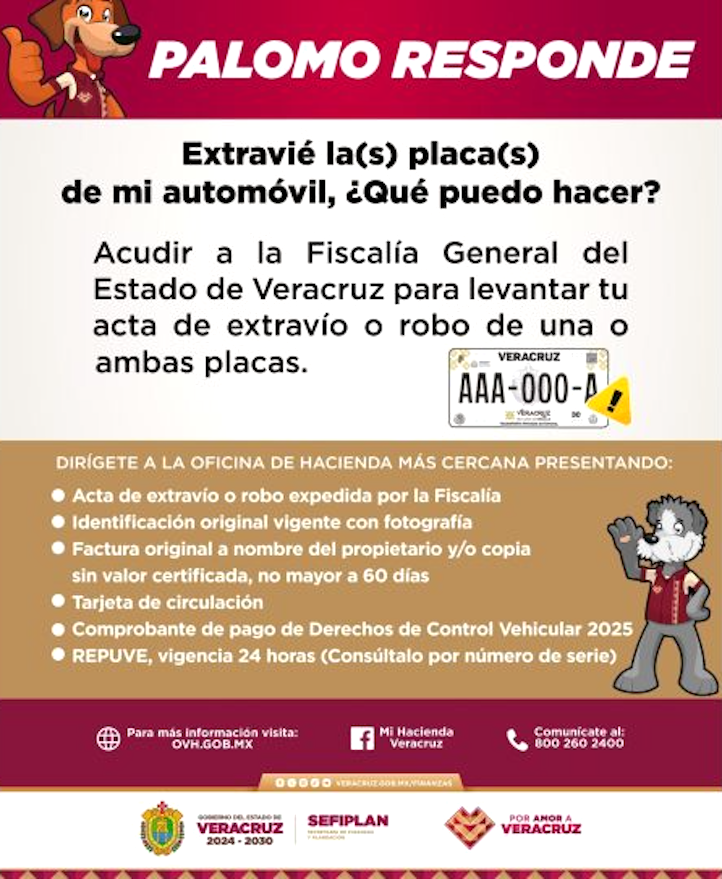 Para mayores informes, Sefiplan pone a disposición la página oficial: http://www.ovh.gob.mx; https://www.ovh.gob.mx/consulta-tramites/vehiculos/baja-por-perdida-de-una-o-ambas-placas-o-la-calcomania-numeral/ y las redes sociales: Facebook: MiHaciendaVeracruz, X: @SEFIPLANVer_, o comunicarte al 800 260 24 00 de 8:00 a 18:00 horas.