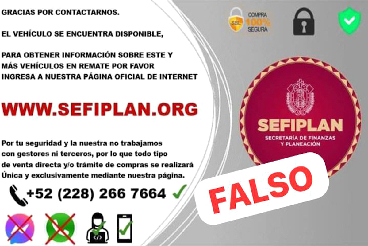 Xalapa, Ver., 20 de febrero de 2025.- La Secretaría de Finanzas y Planeación informa que, tras la detección de páginas apócrifas que suplantaban la Oficina Virtual de Hacienda para recibir pagos de derechos vehiculares y otros impuestos, presentó la denuncia correspondiente ante la Fiscalía General del Estado contra quienes resulten responsables.