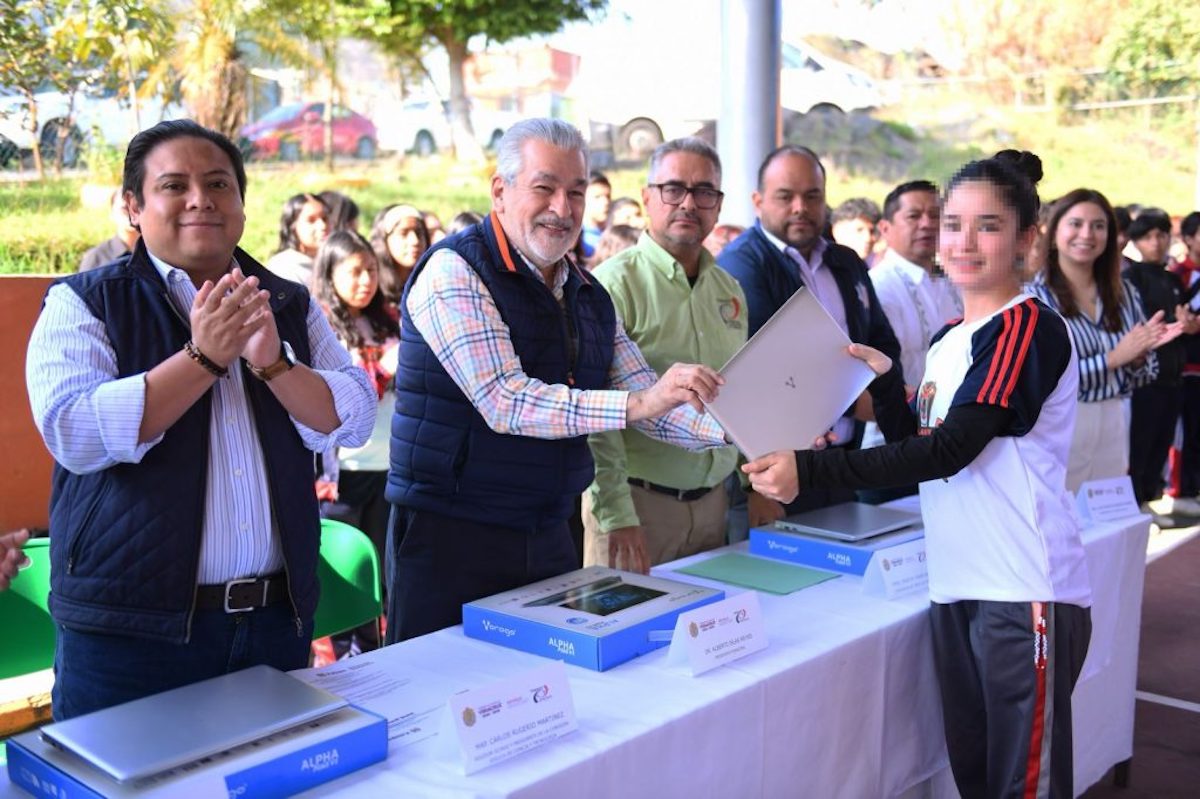 Xalapa, Ver., 06 de marzo de 2025.- Para contribuir a la formación académica de la juventud y formar ciudadanos que impulsen el desarrollo de la ciudad, el alcalde Alberto Islas Reyes encabezó la entrega de equipos de cómputo al Telebachillerato de la congregación Julio Castro, “Las Trancas”, turno matutino, como parte del Programa de Apoyo a las Tecnologías de la Información y las Comunicaciones (TIC’S).