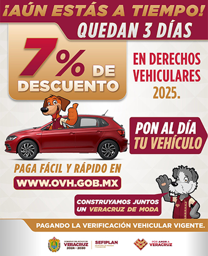 Xalapa, Ver., 28 de marzo de 2025.- La Secretaría de Finanzas y Planeación informa que este lunes concluye el programa de descuentos del 7 por ciento en pago de derechos vehiculares y subsidio del 100 por ciento a la tenencia.