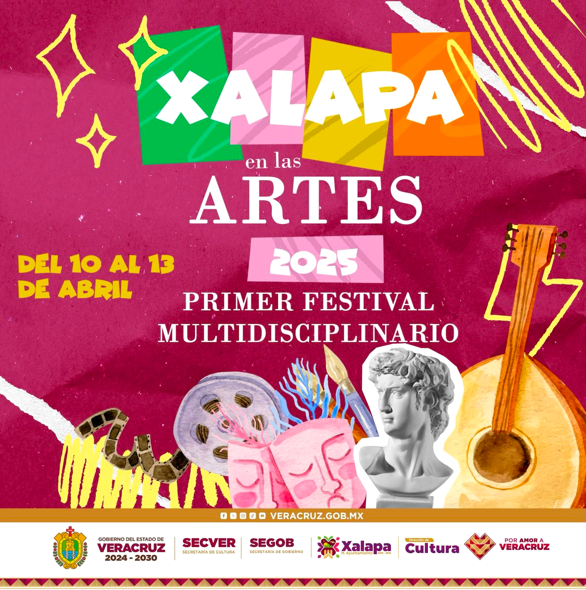 Xalapa, Ver., 03 de abril de 2025.- La Secretaría de Cultura de Veracruz (SECVER), la Coordinación de Promoción de los Valores Cívicos y Culturales del Estado y el Ayuntamiento de Xalapa, invitan a participar en las actividades del Primer Festival Multidisciplinario Xalapa en las Artes 2025, que se llevará a cabo del jueves 10 al domingo 13.