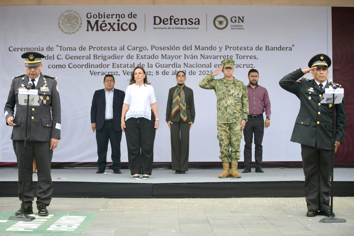 Veracruz, Ver., 08 de abril de 2025.- La gobernadora Rocío Nahle García reiteró la colaboración con las fuerzas federales durante la Toma de Protesta, Posesión del Mando y Jura de Bandera del coordinador estatal de la Guardia Nacional, Iván Navarrete Torres, acto encabezado por el coordinador territorial de la Guardia Nacional en la Región Golfo, Ignacio Murillo Rodríguez.