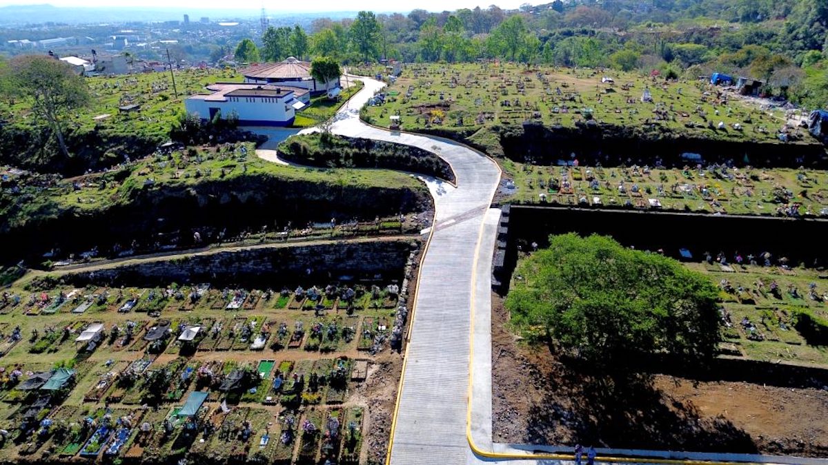 Además, se construyeron 877 metros cuadrados de banquetas, seis muros con cajas de gaviones que abarcan casi 2 mil metros cúbicos y drenaje pluvial para la protección de las tumbas, dadas las pendientes y escurrimientos de agua que se tienen en la zona.