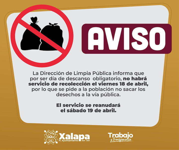 Xalapa, Ver., 17 de abril de 2025.- Por ser día de descanso  obligatorio, el viernes 18 de abril no habrá servicio de recolección de desechos urbanos, informó la Dirección de Limpia Pública.