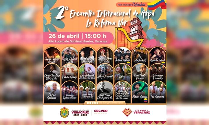 Xalapa, Ver., 23 de abril de 2025.- La Secretaría de Cultura de Veracruz (Secver) invita al 2º Encuentro Internacional de Arpa, que se llevará a cabo el 26 de abril a las 15:00 horas en la localidad de La Reforma del municipio de Alto Lucero.