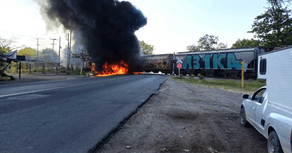 El incidente se suscitó tras el choque entre una pipa que transportaba diésel y un tren de la empresa Ferrosur. A consecuencia del impacto, la pipa se incendió; el fuego continúa activo, por lo que se mantienen las labores de combate en el punto.