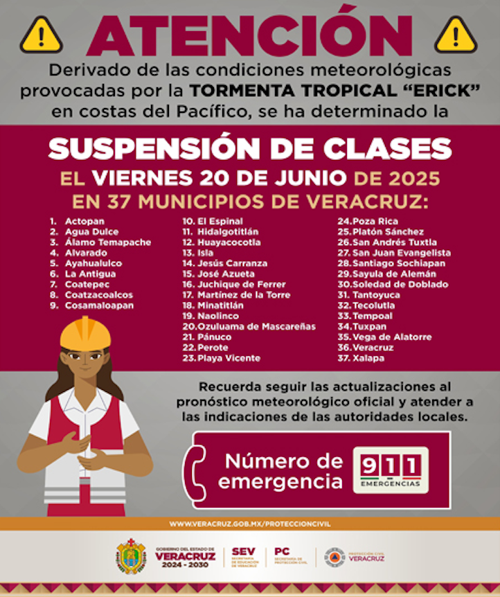 Xalapa, Ver., 19 de junio de 2025.– Ante las afectaciones provocadas por la Tormenta Tropical Erick, el Gobierno del Estado, a través de las secretarías de Educación y de Protección Civil, determinó suspender las clases y actividades escolares de este viernes, en los turnos matutino y vespertino, en 37 municipios, como medida preventiva.