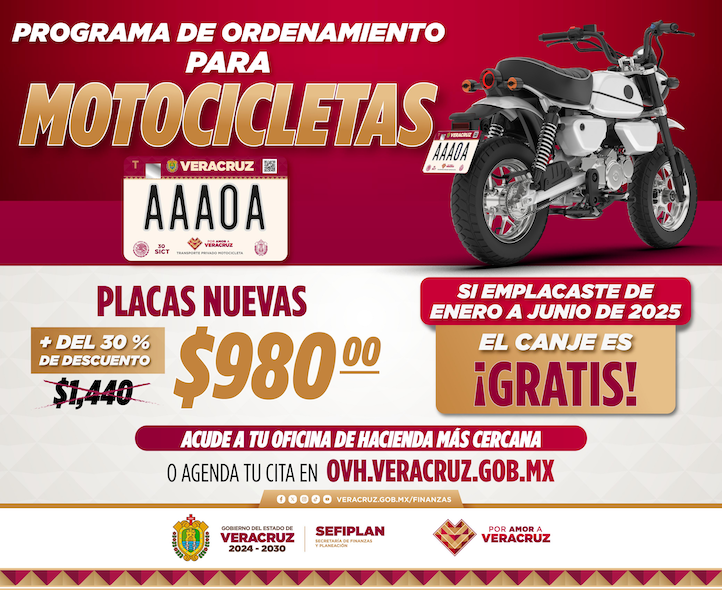 Xalapa, Ver., 21 de junio de 2025.- Del 23 de junio y hasta diciembre, la Secretaría de Finanzas y Planeación (Sefiplan) implementará el programa de ordenamiento vehicular exclusivo para motocicletas, con un costo de 980 pesos.
