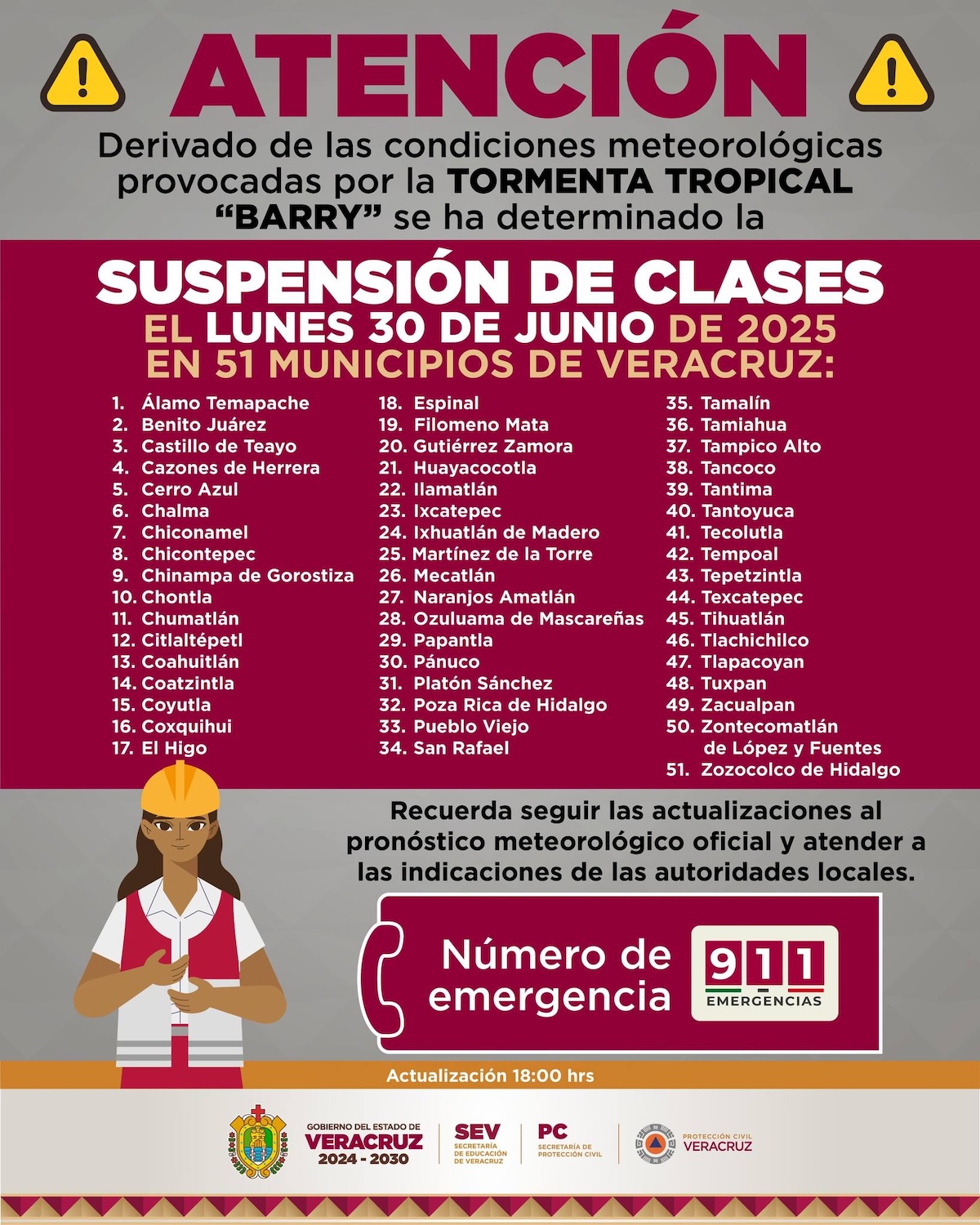 Xalapa, Ver., 29 de junio de 2025.- Debido a los efectos de la Tormenta Tropical Barry, el Gobierno del Estado, a través de las secretarías de Educación y de Protección Civil, determinó suspender las clases y actividades escolares de este lunes, en los turnos matutino y vespertino, en 51 municipios, como medida preventiva.
