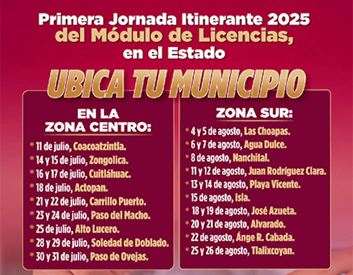 Xalapa, Ver., 01 de julio de 2025.- La Secretaría de Seguridad Pública (SSP), a través de la Dirección General de Transporte del Estado, implementa del 01 de julio al 26 de agosto la Primera Jornada Itinerante 2025 del Módulo de Licencias, acercando este servicio a diversas regiones y facilitar el trámite a la población. El Módulo Móvil recorrerá distintas localidades con el siguiente calendario: Zona … Continúa leyendo Jornada itinerante del Módulo de licencias de conducir inicia SSP