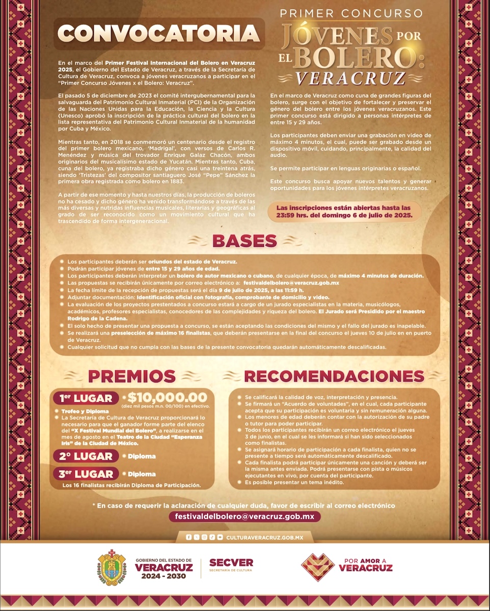 Xalapa, Ver., 04 de julio de 2025.- La Secretaría de Cultura de Veracruz convoca a jóvenes oriundos del estado a participar en el primer Concurso Jóvenes por el Bolero: Veracruz. Esta convocatoria se realiza en el marco del primer Festival del Bolero que se celebrará del 10 al 13 de julio en Veracruz y Tlacotalpan.