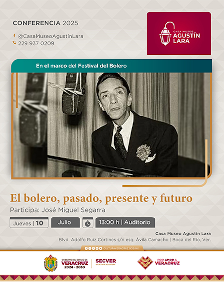 Veracruz, Ver., 08 de julio de 2025.- La Secretaría de Cultura de Veracruz invita a la conferencia magistral El Bolero, paso, presente y futuro, que se realizará el próximo jueves a las 13:00 horas, en el auditorio de la Casa Museo Agustín Lara, con entrada gratuita y cupo limitado.