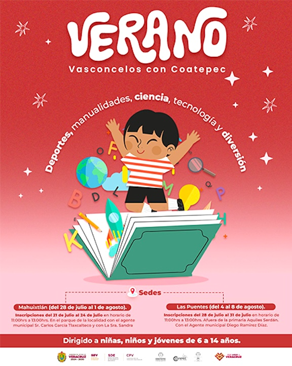 Xalapa, Ver., 22 de julio de 2025.- Como una iniciativa cultural y recreativa, la Secretaría de Educación de Veracruz, a través de la Subsecretaría de Desarrollo Educativo y la Coordinación del Programa Vasconcelos, en colaboración con el Ayuntamiento, llevará el programa Verano Vasconcelos a niñas, niños y jóvenes de Coatepec.