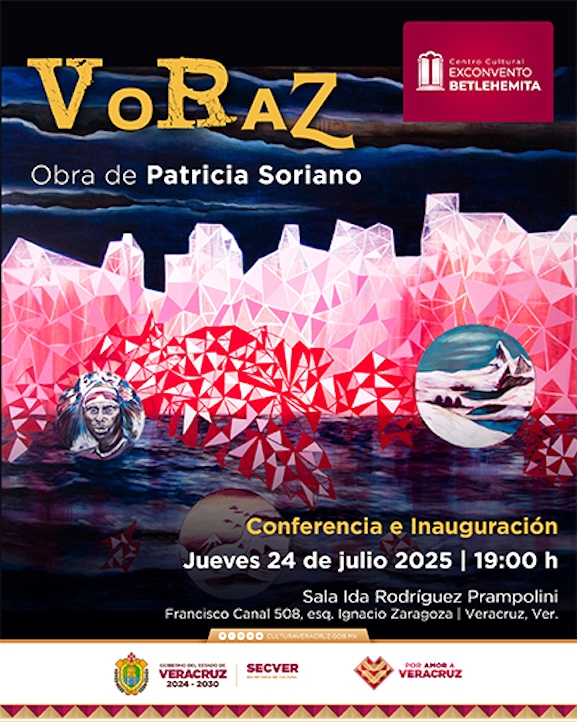 Veracruz, Ver., 23 de julio de 2025.- La Secretaría de Cultura de Veracruz (Secver) inaugurará la exposición Voraz, obra de Patricia Soriano, acompañada de una conferencia, en la sala Ida Rodríguez Prampolini del Exconvento Betlehemita, mañana jueves a las 19:00 horas. La entrada es gratuita.