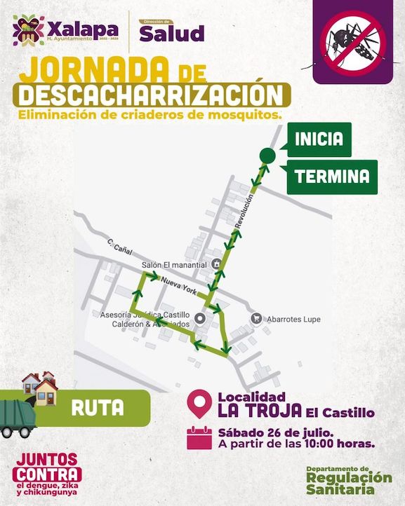 Xalapa, Ver., 24 de julio de 2025.- Con el propósito de contribuir a prevenir enfermedades transmitidas por vectores como el dengue, el Ayuntamiento, a través de la Dirección de Salud, invita a vecinas y vecinos de la localidad La Troja, en la congregación El Castillo, a la jornada de descacharrización que se llevará a cabo en esta comunidad el próximo sábado.