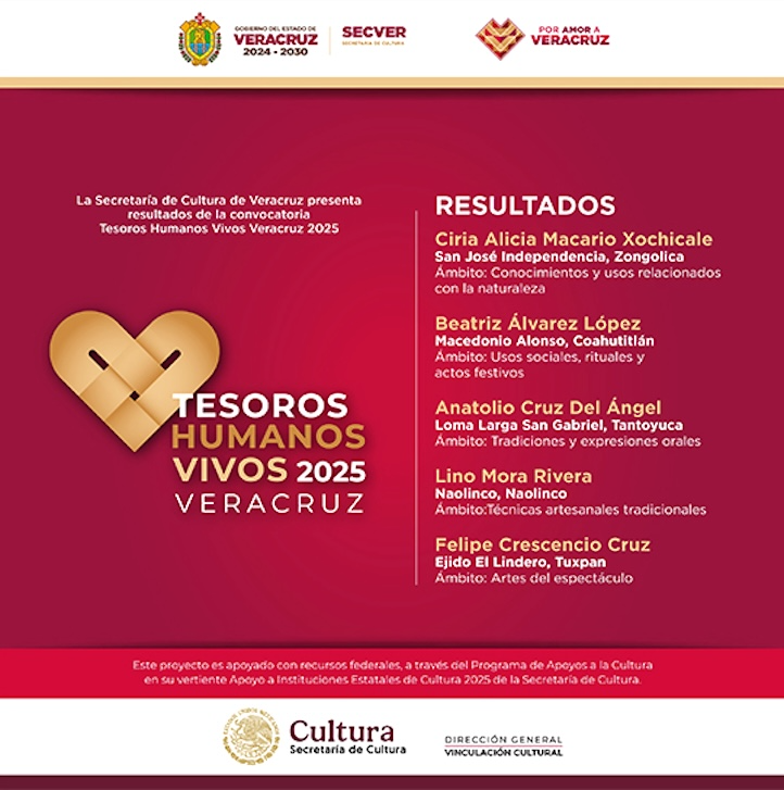 Consulta los resultados de la convocatoria Tesoros Humanos Vivos de Veracruz 2025 en las redes sociales de la dirección de @DesarrolloCulturalRegionalSECVER y la @SECVERoficial.