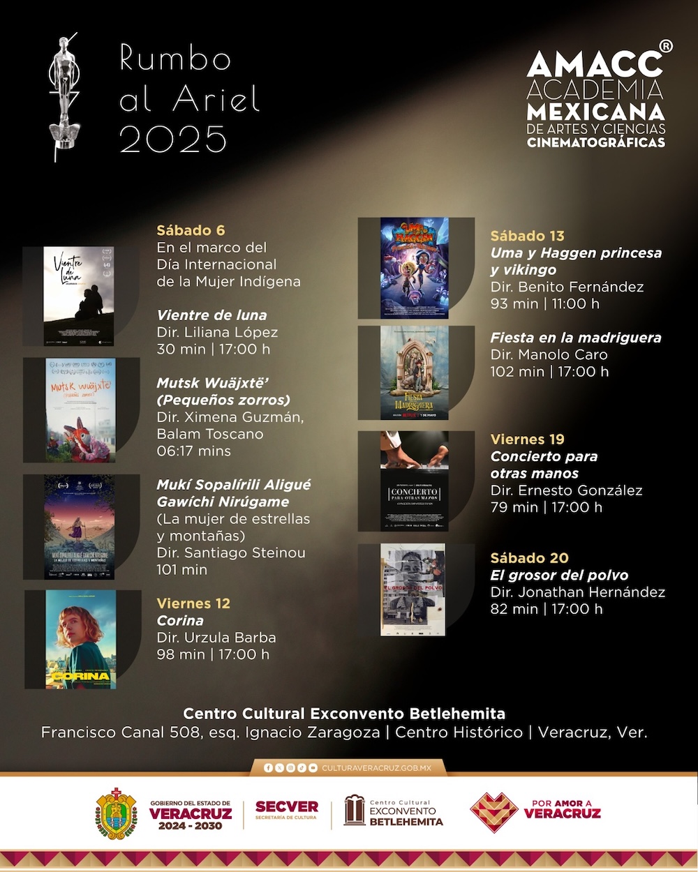 Xalapa, Ver., 06 de septiembre de 2025.- La Secretaría de Cultura de Veracruz (SECVER) invita a las proyecciones del programa Rumbo al Ariel 2025 que se llevarán a cabo los viernes y sábados del 06 al 20 de septiembre en el Auditorio del Centro Cultural Exconvento Betlehemita. La entrada es gratuita.
