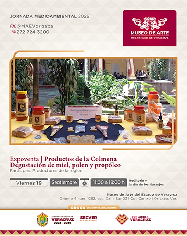 Xalapa, Ver., 18 Septiembre 2025.- La Secretaría de Cultura de Veracruz invita a participar en la Jornada medioambiental que se llevará a cabo este viernes 19, de 11:00 a 18:00 horas, en el Museo de Arte del Estado de Veracruz (MAEV) en Orizaba, en coordinación con la oficina de Fomento Apícola de la Secretaría de Desarrollo Agropecuario, Rural y Pesca.