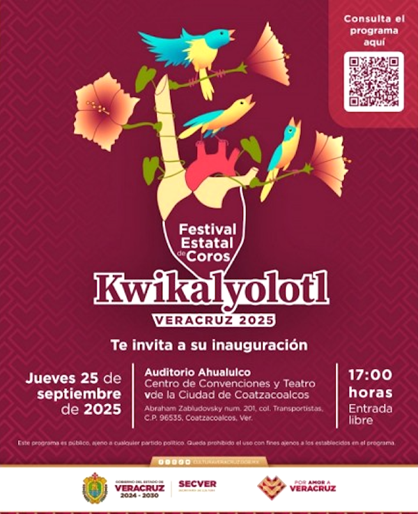 Xalapa, Ver., 24 Septiembre 2025.- La Secretaría de Cultura de Veracruz (Secver), a través de la Dirección de Formación y Desarrollo Artístico, invita participar en la convocatoria del Festival Estatal de Coros Kiwikalyolotl (Corazón que canta), a realizarse 25 al 28 de septiembre en Coatzacoalcos.