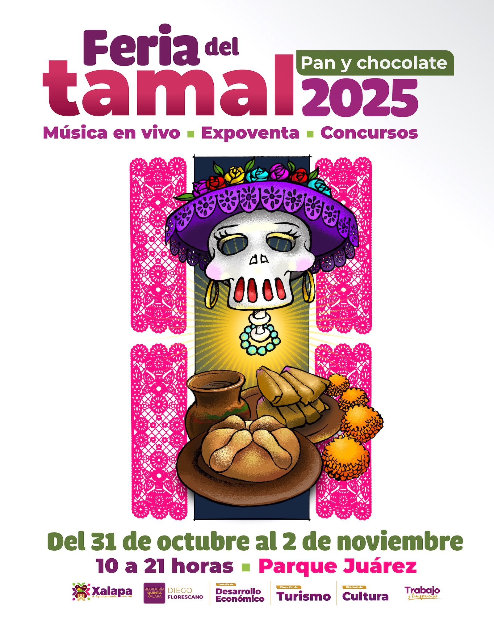 Xalapa, Ver., 08 Octubre 2025.- Con la participación de 50 expositores de Xalapa y la región, del 31 de octubre al 2 de noviembre, se llevará a cabo en el parque Benito Juárez la Feria del Tamal, Pan y Chocolate Xalapa 2025, evento con el que el Ayuntamiento fomenta el desarrollo económico y fortalece el turismo gastronómico.
