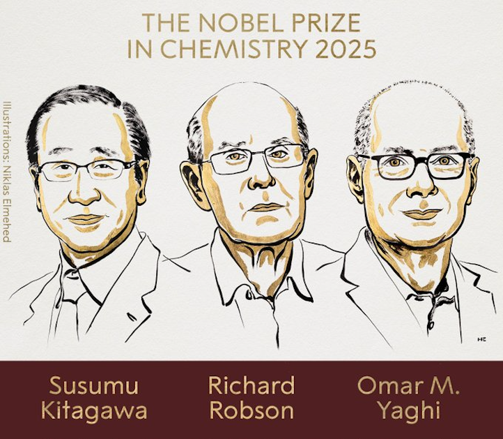 Estocolmo, Suecia, 08 Octubre 2025.- El japonés Susumu Kitagawa, el británico Richard Robson y el jordano-estadounidense Omar M. Yaghi ganaron este miércoles el Premio Nobel de Química por sus aportes en “el desarrollo de estructuras metalorgánicas”. El trío fue galardonado por haber “creado construcciones moleculares con grandes espacios a través de los cuales pueden fluir gases y otros productos químicos”.