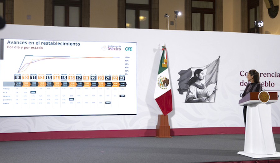 La directora general de la Comisión Federal de Electricidad, Emilia Calleja Alor, detalló que se tiene un avance de 99.82 por ciento en el restablecimiento del suministro eléctrico. En San Luis Potosí se alcanzó el 100 por ciento desde el 11 de octubre, en Querétaro desde 16 de octubre, en Puebla desde el 21 de octubre, en Veracruz el 23 de octubre, mientras que en el caso de Hidalgo se tiene un 99 por ciento, quedando 466 usuarios afectados por atender.