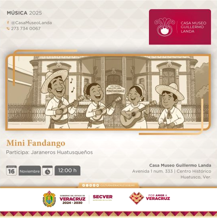 Xalapa, Ver., 14 Noviembre 2025.- La Secretaría de Cultura de Veracruz (Secver) invita a asistir al Mini fandango, que tendrá lugar el domingo 16 de noviembre a partir de las 12:00 horas, en el recinto cultural Casa Museo ‘Guillermo Landa’, ubicado en Huatusco. La entrada es libre.